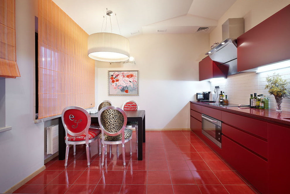 - Floor. As a floor finish, it is possible to use laminate or red tiles, which are very easy to clean and are not afraid of dirt. Also, the floor is decorated with modern linoleum or high-quality porcelain stoneware, which does not conflict in color with furniture and wall cladding and apron.