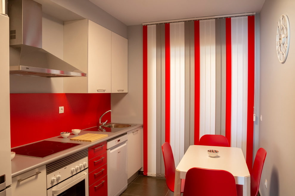 The choice of curtains for a red kitchen depends on the color scheme of the headset. If it is made in bright colors, it is better to choose neutral curtains in gray, white, cream, creamy or beige tones muffling the intense fiery color and at the same time emphasizing its saturation.