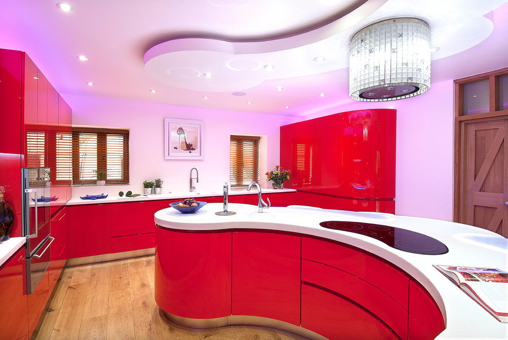 - Ceiling. To create an accent on the ceiling, or vice versa, to give it a discreet look, you can use a stretch canvas with a mirror glossy or muted matte texture. In the design of a red kitchen, a plasterboard structure with built-in lighting will look great, a plastic or slat system in white to create a tone contrast.