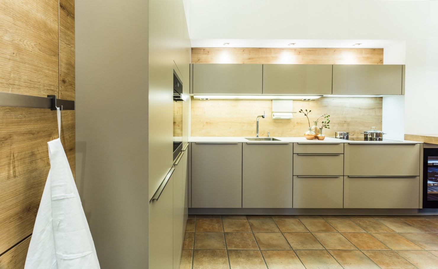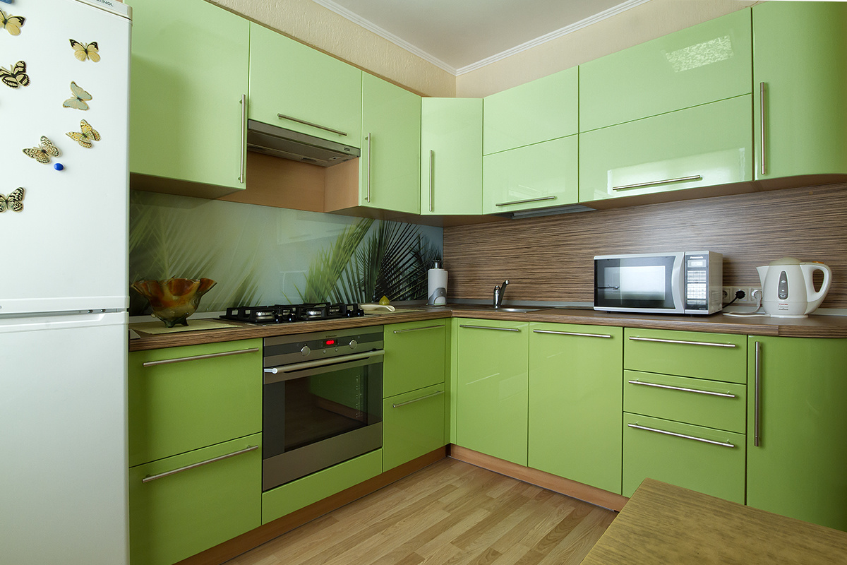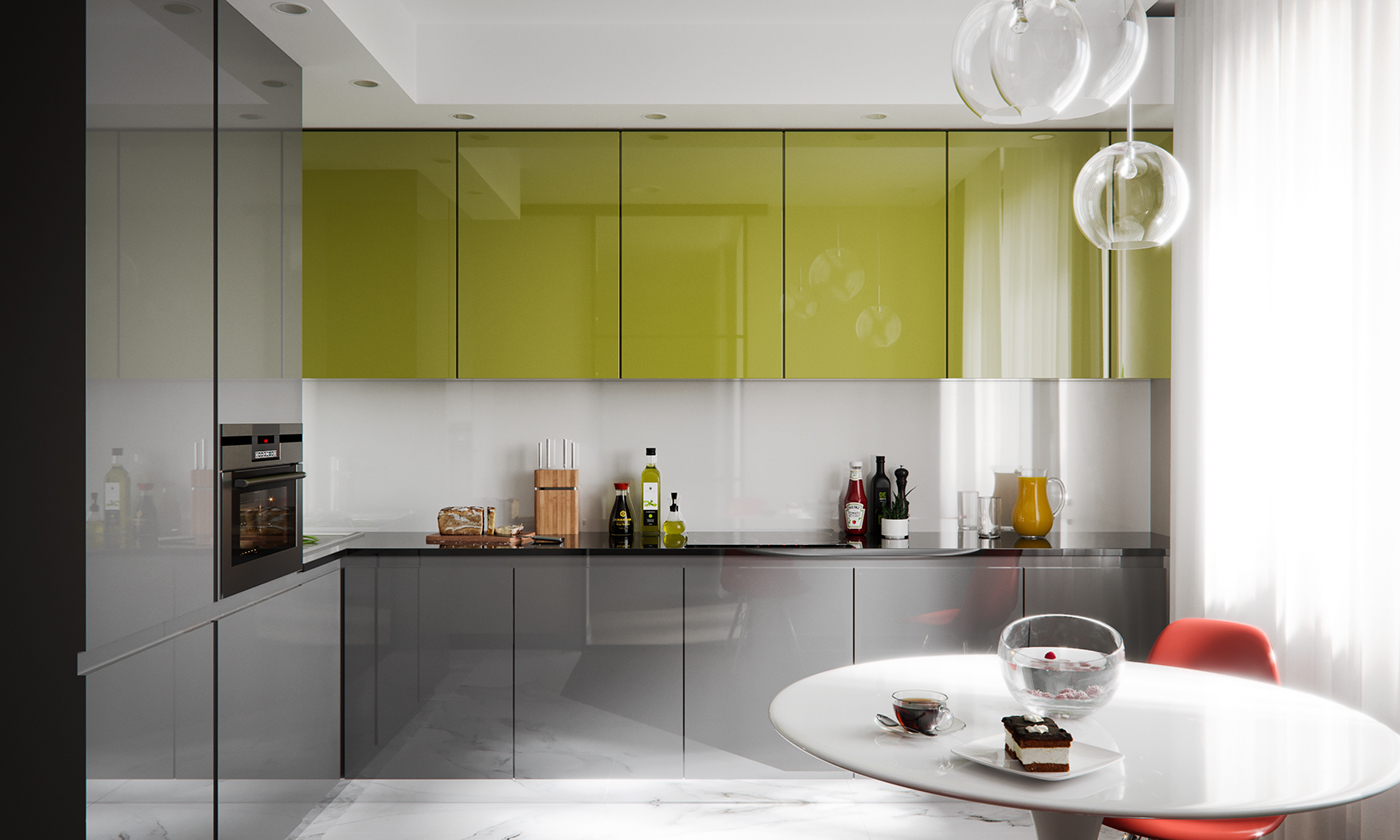 Modern interior in olive color prefers glossy fronts without handles, white or black color of the table top, apron, decoration.