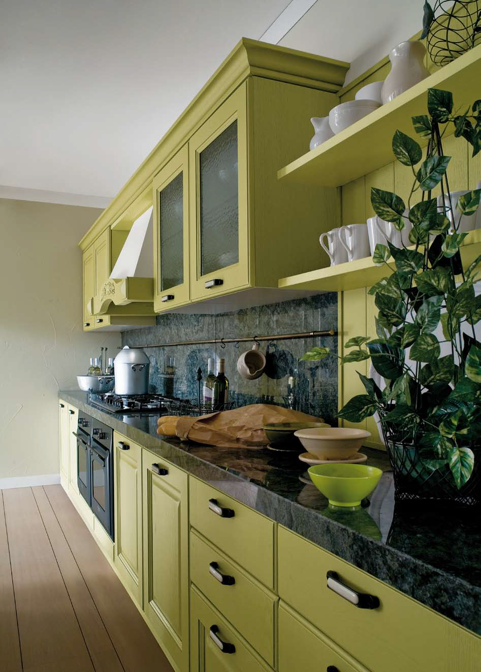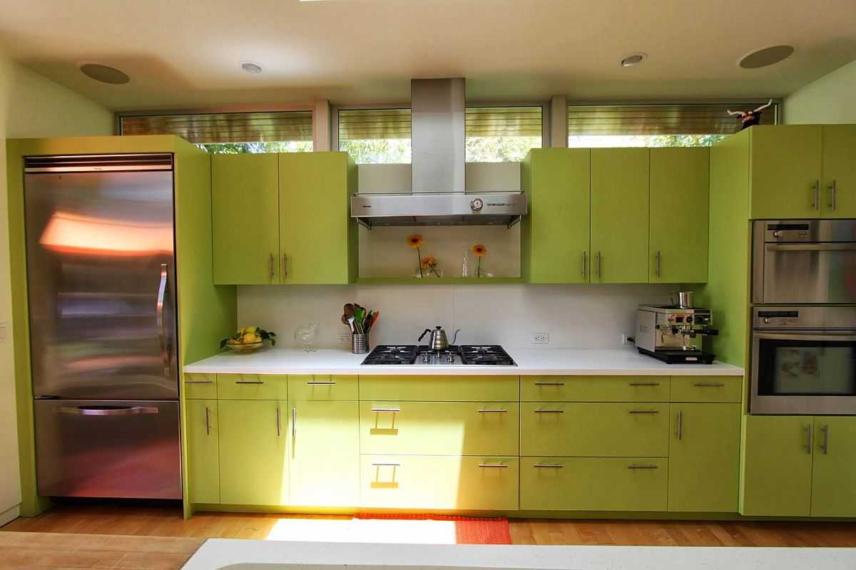 - Lighting... Green, especially in combination with yellow, is a rather complex base for highlighting. The main rule is no warm lamps, otherwise the room will seem more dirty yellow than olive. With too cold light, gray will come out and the kitchen will seem dirty.