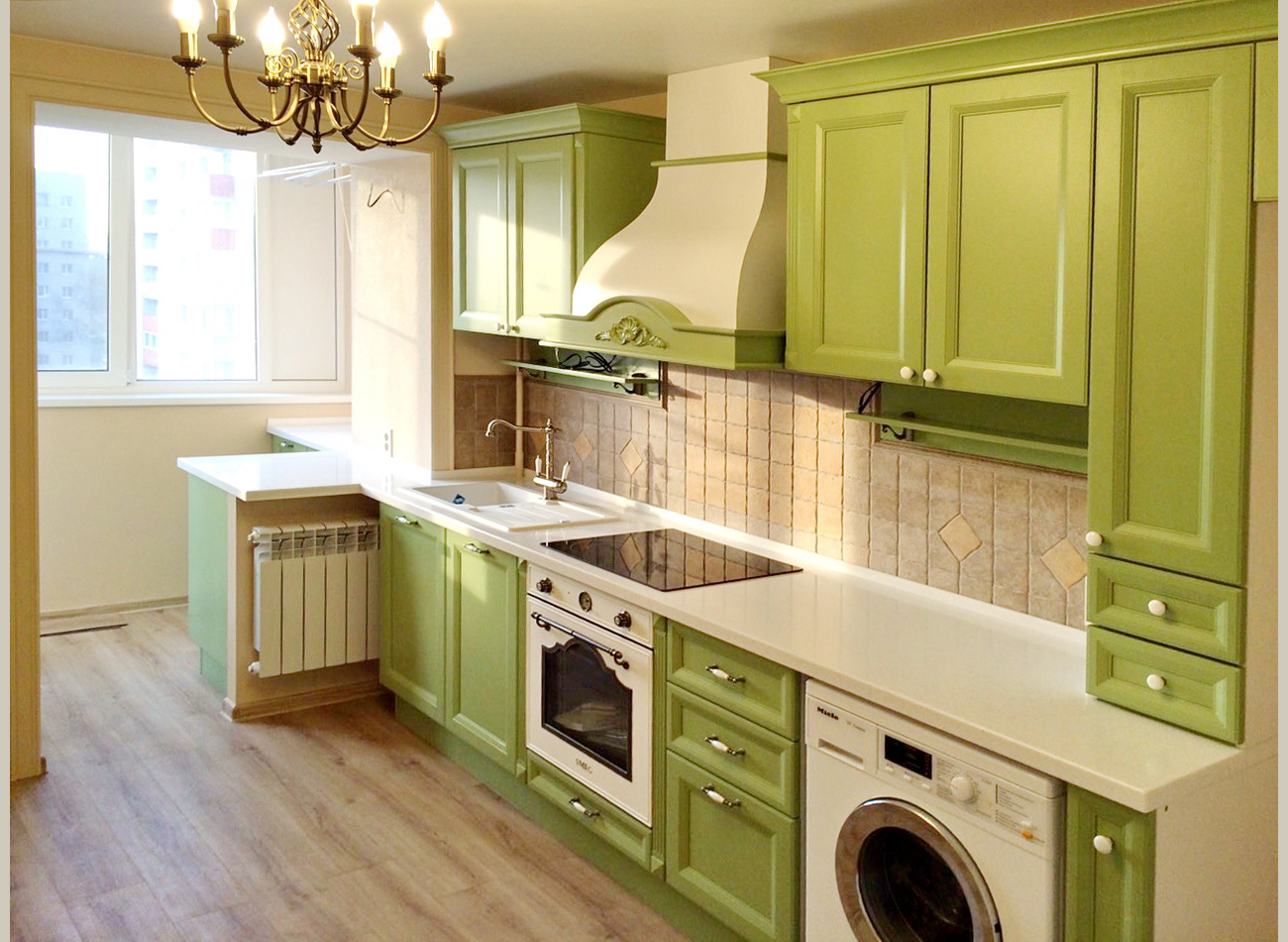 The kitchen of a delicate olive color harmoniously combines with a light sandy hue. Most often, this symbiosis can be found on olive kitchens in classic style, when cabinets and facades are made green, and walls in the kitchen and other details are left beige.