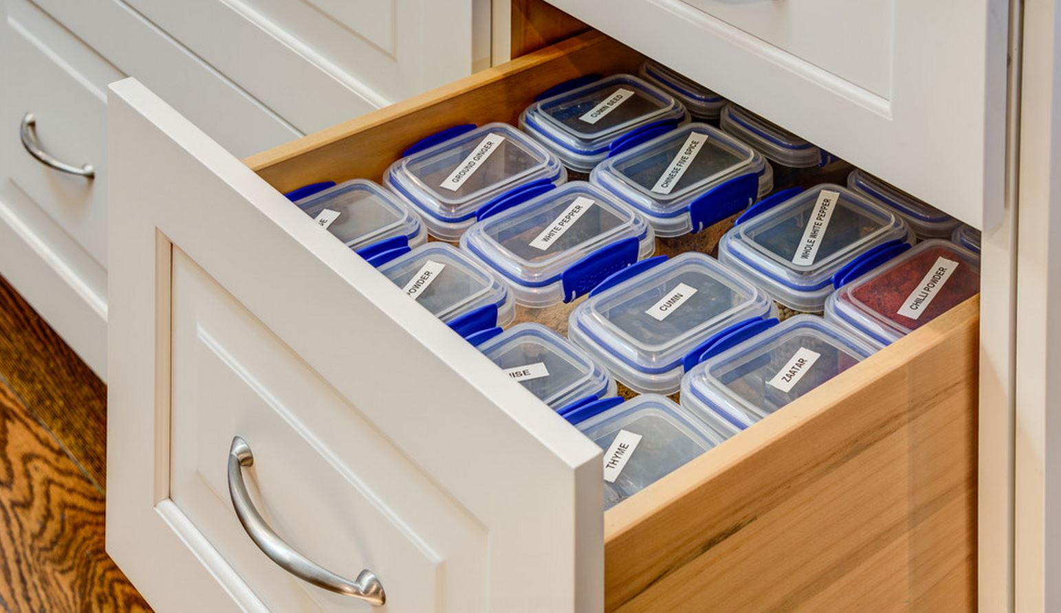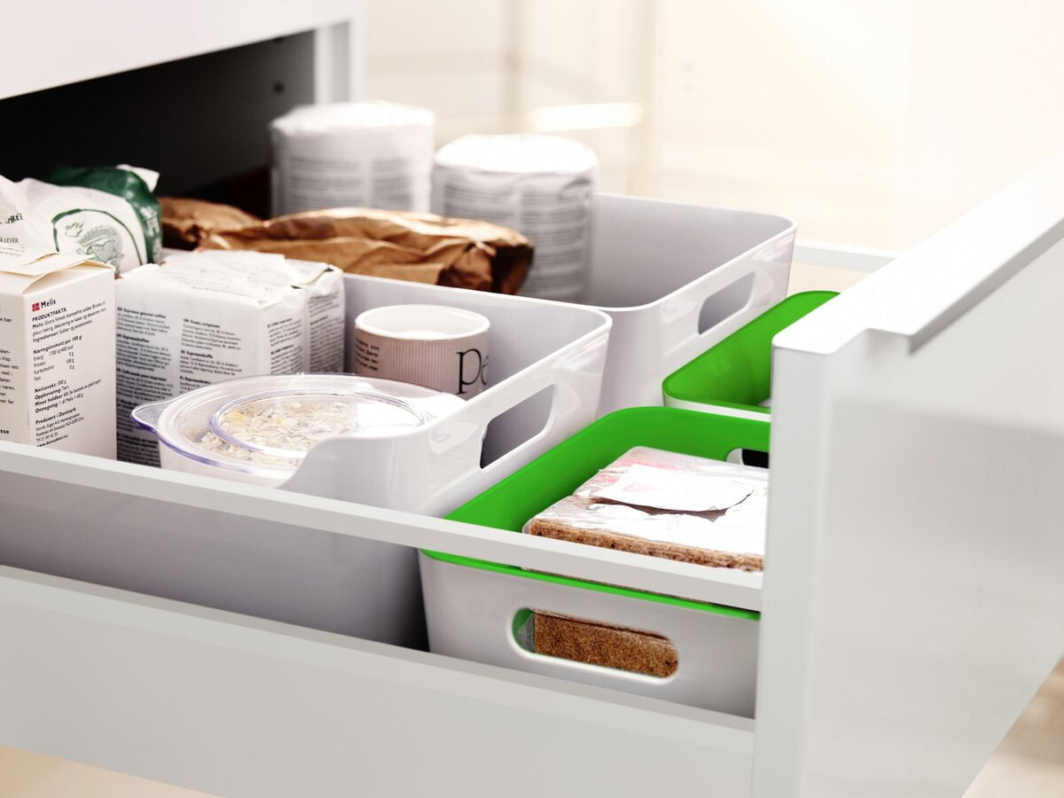 For storage in a kitchen cabinet, it is more ergonomic to use containers and trays with straight rather than round corners: they stand close to each other and save significantly more space than a set of jars. Rectangular kitchen appliances also fall under this rule.
