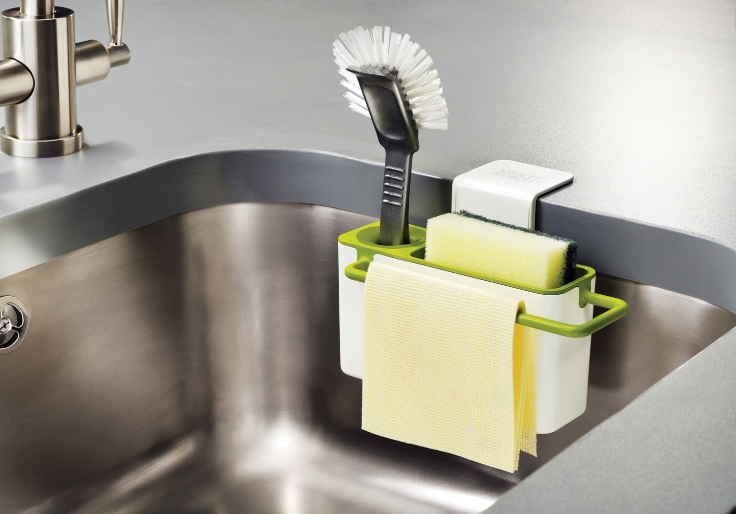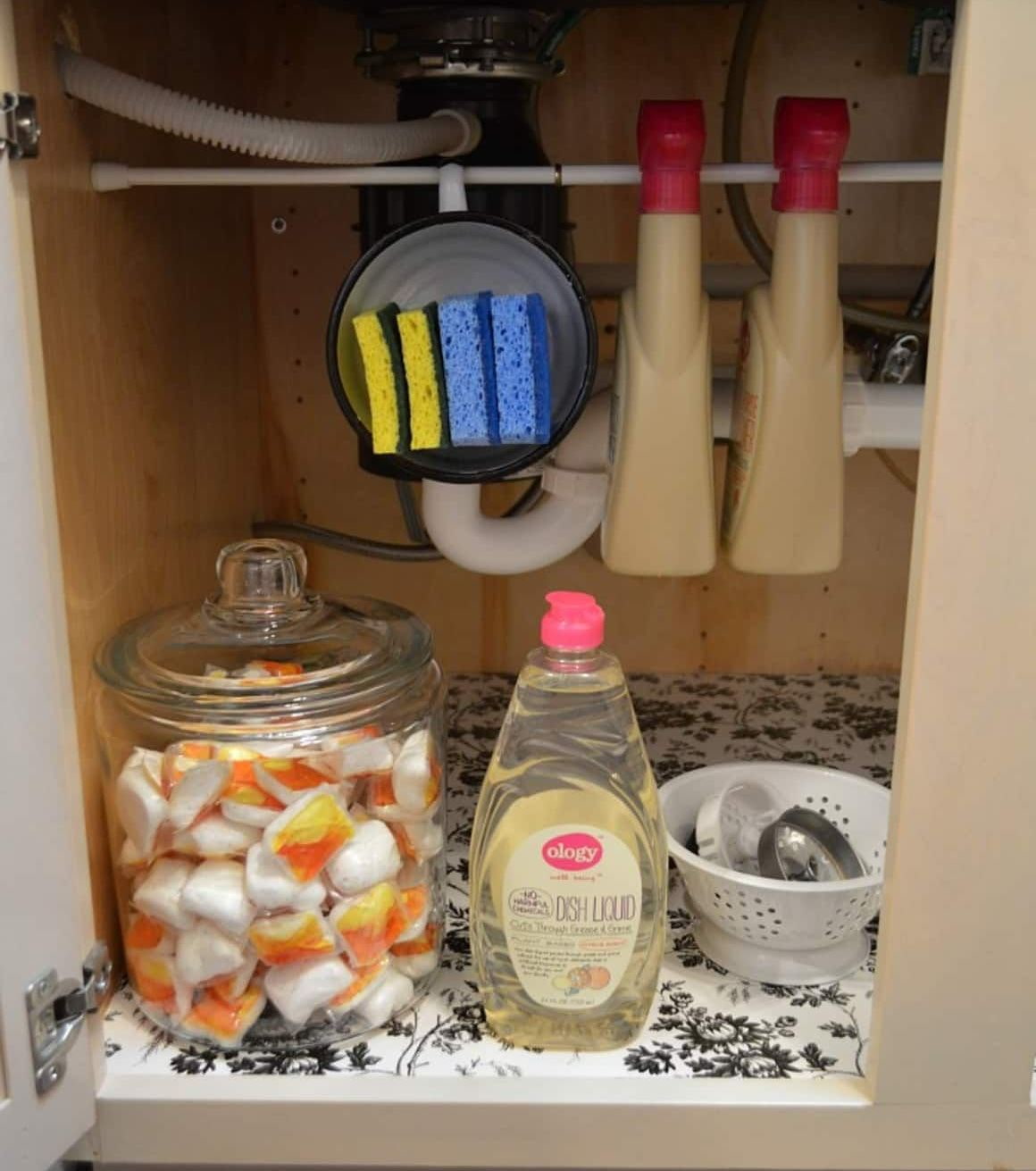 Handy tools are great for storing sponges and cleaning products near the sink. These accessories look neater than bottles and rags scattered around the sink.