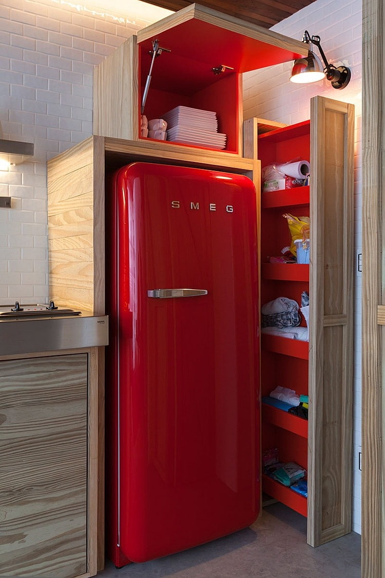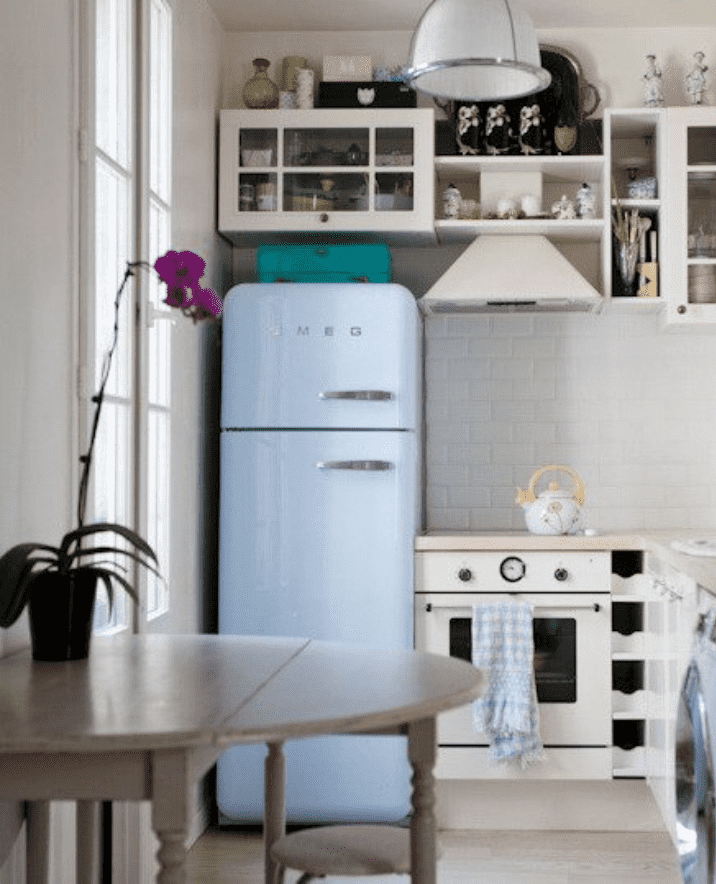 If the refrigerator is not built into the kitchen storage system and the space above it is empty, it is recommended to mount an open shelf, cabinet or mezzanine on top.