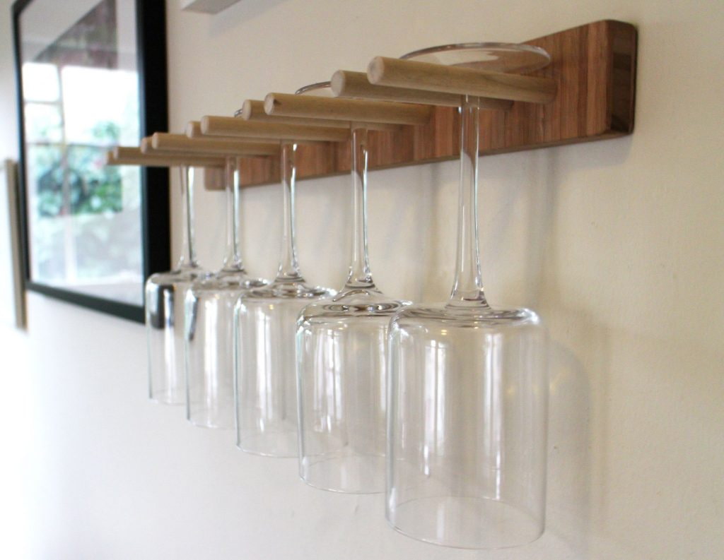 Glass goblets can become an interior decoration if you make a special shelf and hang them by the legs. The structure should not interfere with cooking and moving around the kitchen. Also on sale you can find a device that is located in the inside of the lockers.