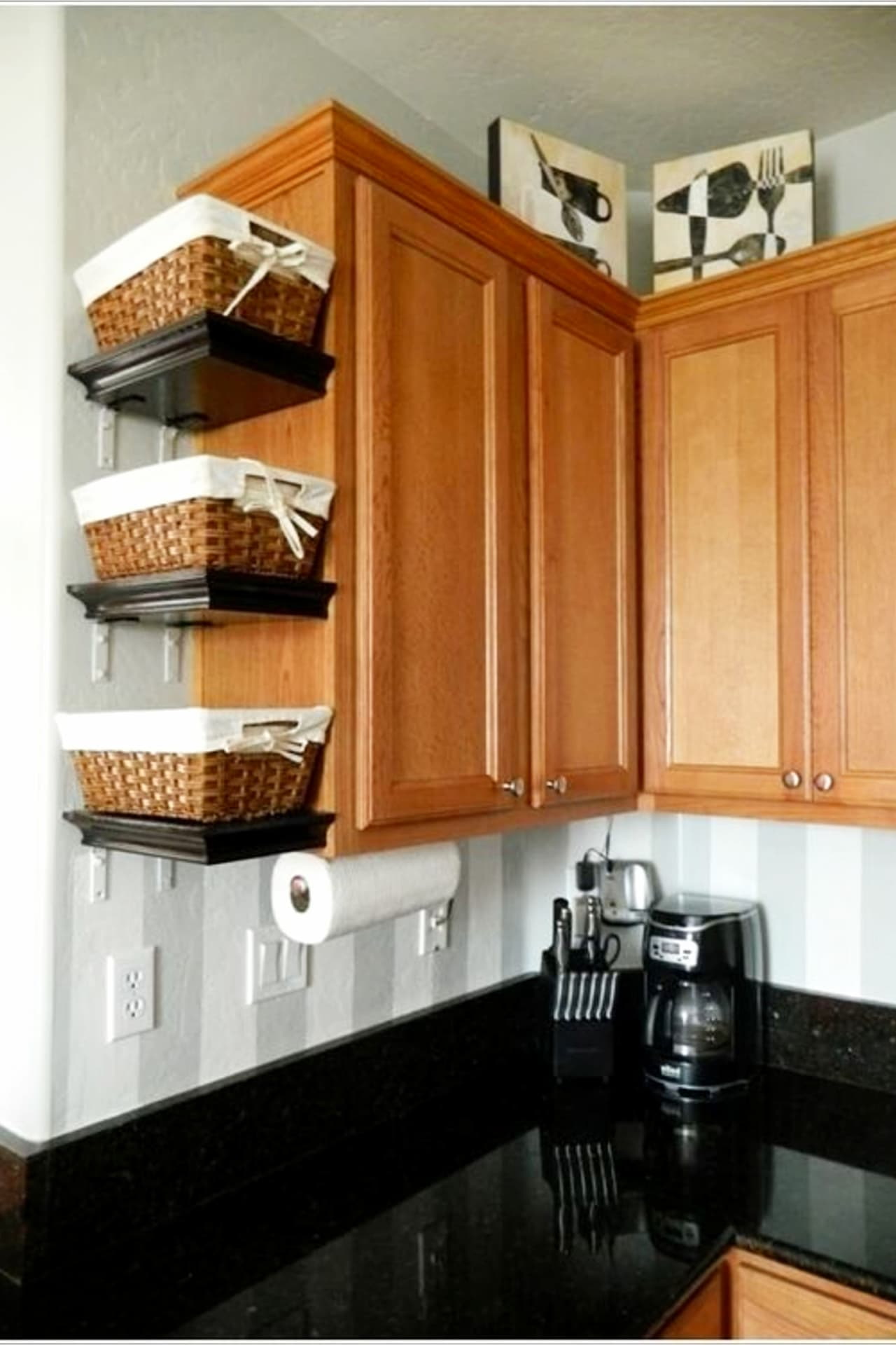 If the furniture in the kitchen remains the same, you can use the top of the cabinets and put closed boxes or baskets on them with useful things that are not in demand every day.