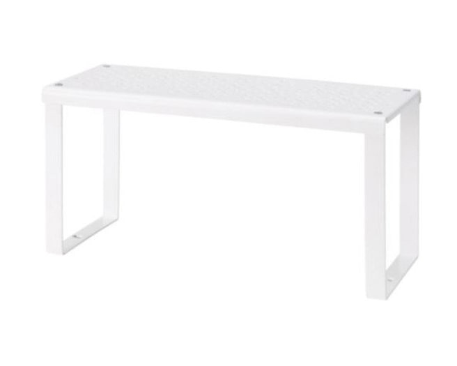 The white shelf takes up very little space, but increases the usable area in cabinets and cabinets. You can store dishes, food and jars on it - the legs of this rack are made of steel, it is durable and strong. Two or more inserts are connected using the supplied screws. Available in two sizes: 32x13x16 (price RUB 399) and 32x28x16 (RUB 499)