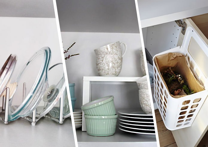 These products help to organize many items necessary in the kitchen, ergonomically and functionally using the interior space of cabinets and drawers. Inexpensive fixtures will not only save space, but also reduce cooking time.