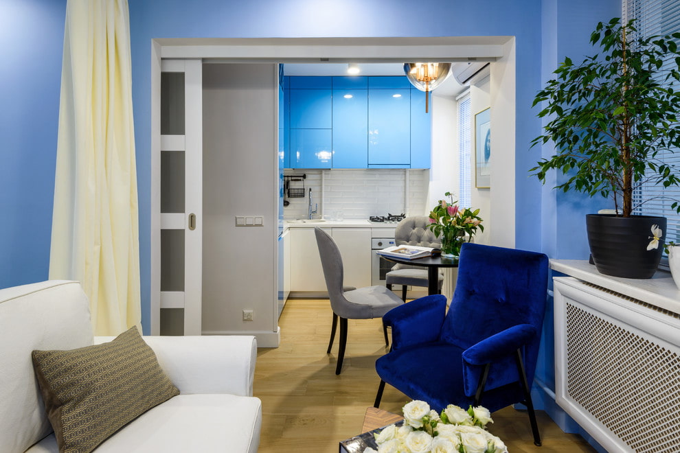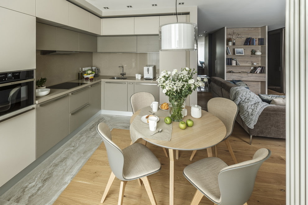 When dividing the space, rely on the dimensions of the premises. Forsmall kitchen and living room Use subtle zoning, such as different flooring, area lighting, and furniture. Place the dining group in the center or place the sofa with its back facing the cooking area.