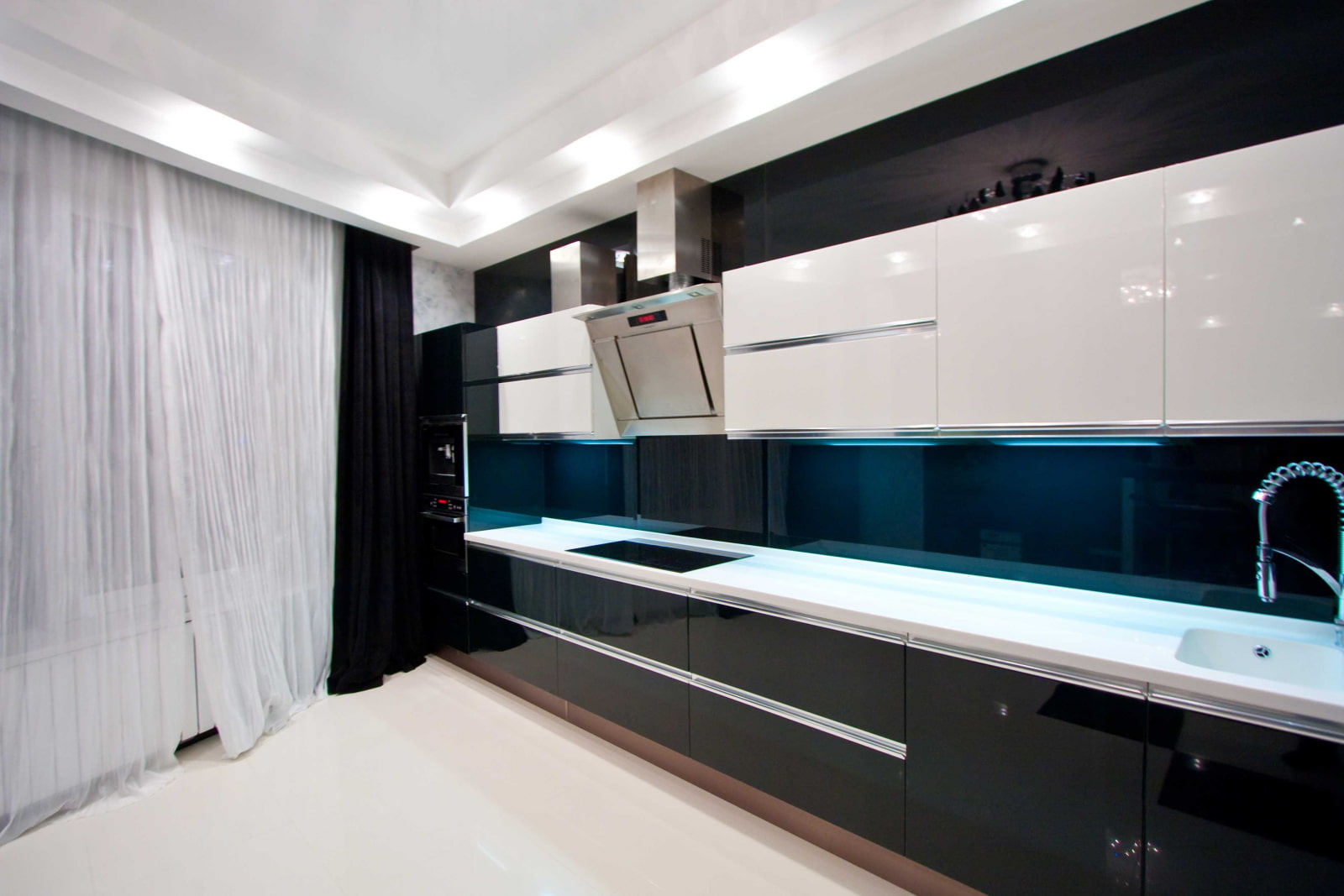 For a black kitchen, curtains in beige, gray or other pastel colors that are minimally different from the general composition will be appropriate. It is possible to use canvases with small geometric prints, sophisticated silver ornaments or an original pattern in the form of dominoes. In the design, you should not use products made of too dense and dark fabric. Air tulle is ideal for decorating windows.