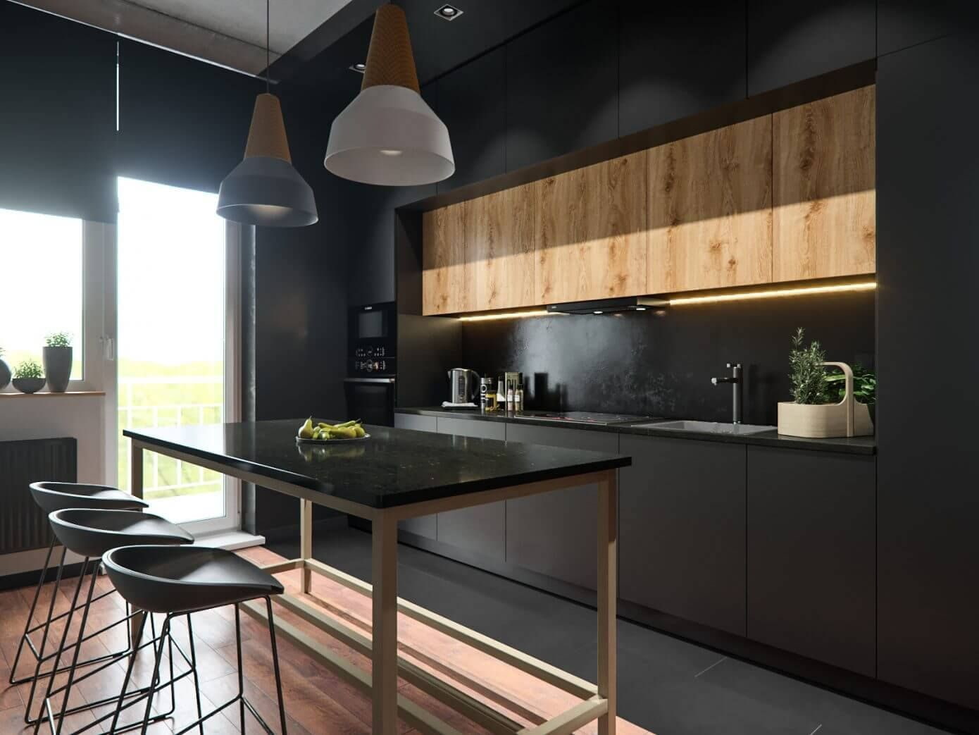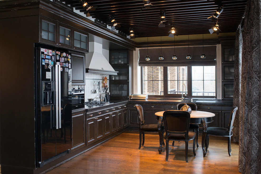 Dark facades clearly emphasize the geometry of the room and are in perfect harmony with light finishes, gilding or marble countertops. The set can have a varnish, glossy or matte surface with a pronounced woody texture. Black design is sometimes used partially, only for the bottom or top of the structure.