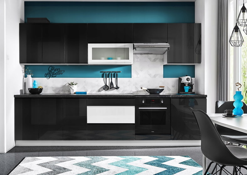 Striking black, combined with dark indigo, will create a crushing atmosphere in the kitchen. Therefore, turquoise or classic blue colors are mainly selected as a companion, filling the room with freshness. The black and blue palette will look harmonious in a duet with brown or white.