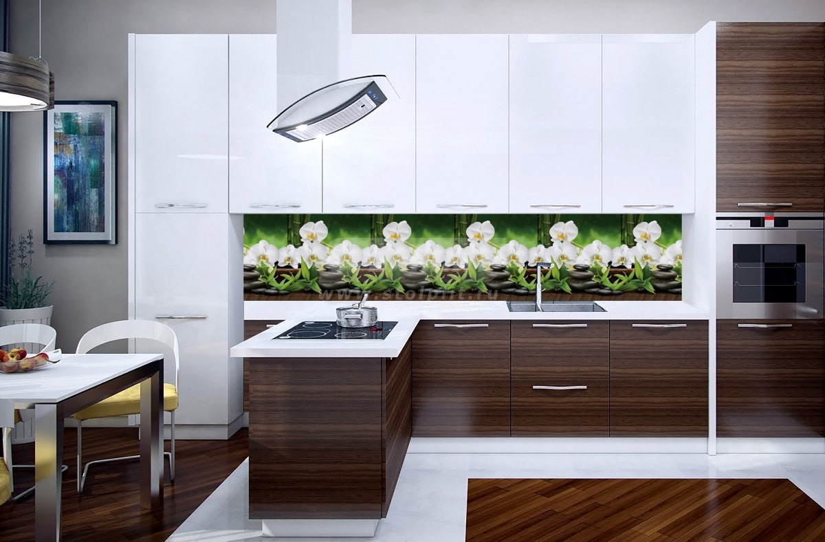 Most often, shades are made to repeat facades - for example, on white kitchen - white orchids, on black and red - cherries on a dark background.