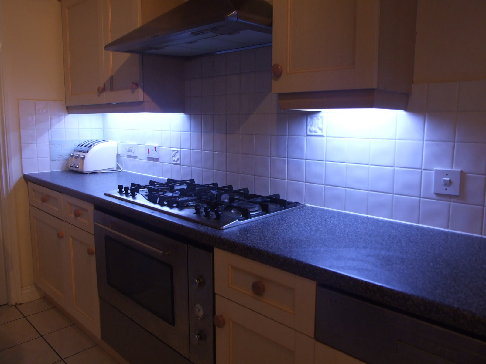 In the photo there is a light in the corner under the cabinets