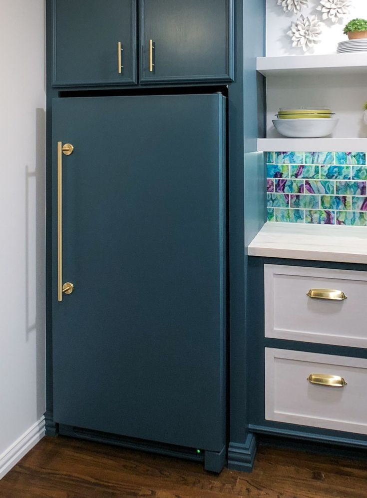 The photo shows a combination of a repainted pink refrigerator and blue kitchen