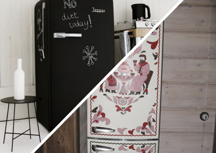 If you have an artistic gift and the color of the equipment suits you in general, do not completely repaint the refrigerator: just draw something beautiful on it... Folk motifs such as Khokhloma or Gzhel will not fit into every interior, but there are more modern options: doodles, flowers, geometric prints.