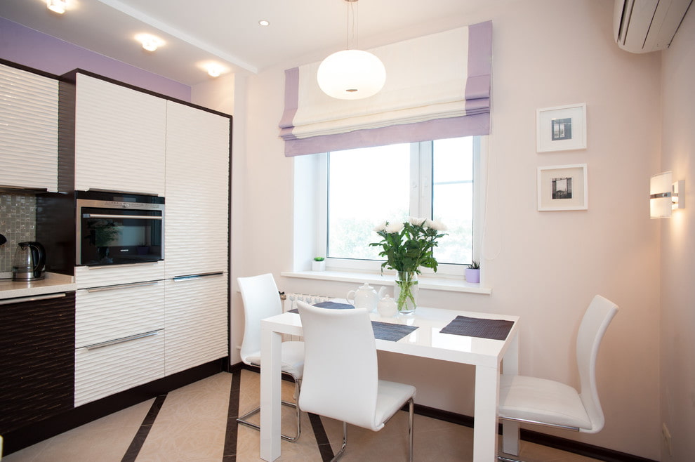 Roman blinds for the kitchen with a door to the balcony, thanks to the convenient length adjustment, will be an excellent option for a balcony opening. They will not interfere with the functioning of the door and the exit to the loggia.