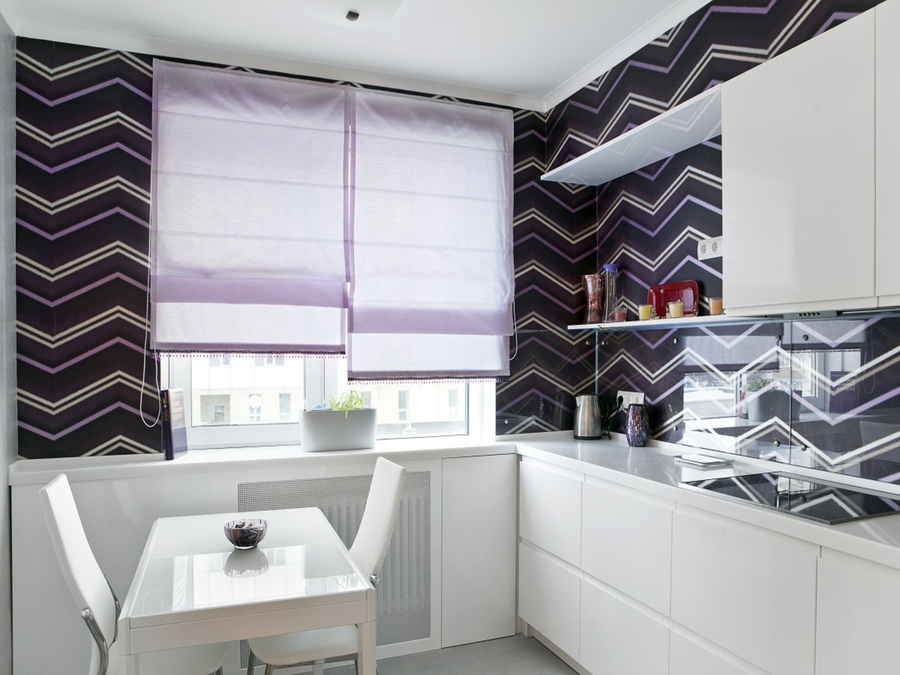 In the photo there is a kitchen and patterned Roman curtains with an option for mounting on a window opening.