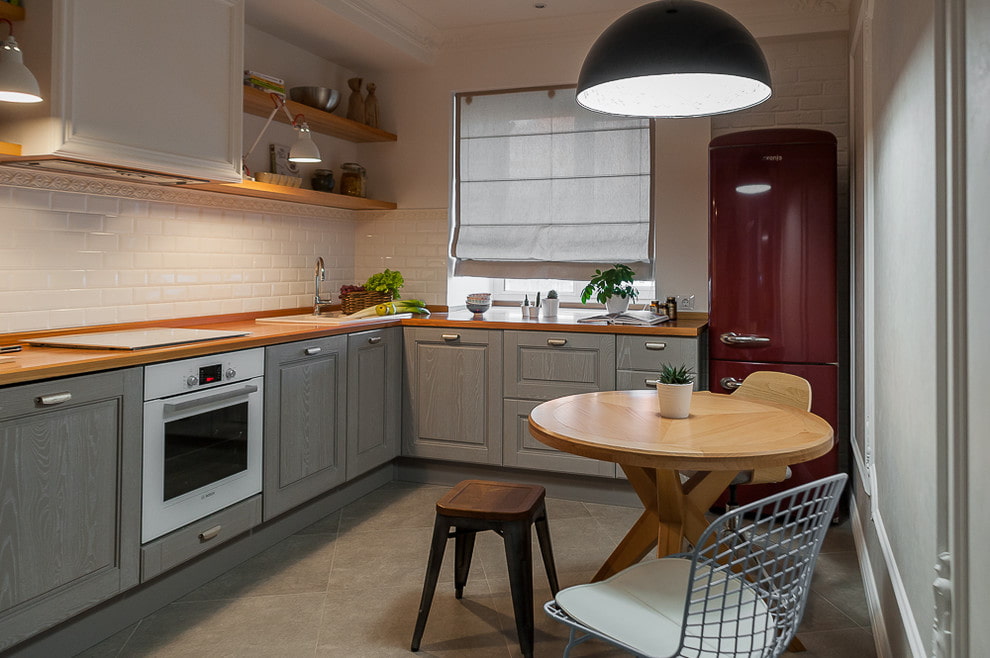 Roman curtains, combining practicality and elegance, perfectly complement the overall look of a classic and neoclassical kitchen, bring zest to it and create the necessary accents.