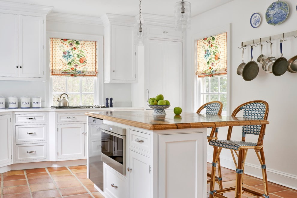 Pictured is a country-style kitchen with checkered Roman curtains on the window.
