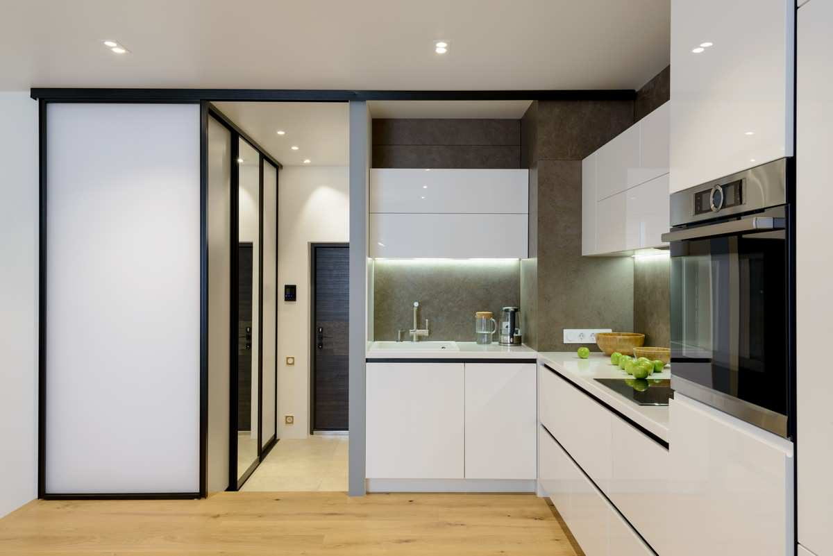 If needed equip a small kitchen and at the same time make it visually more spacious, it is better to choose a light gray furniture set with glossy facades, and make the walls and ceiling white.