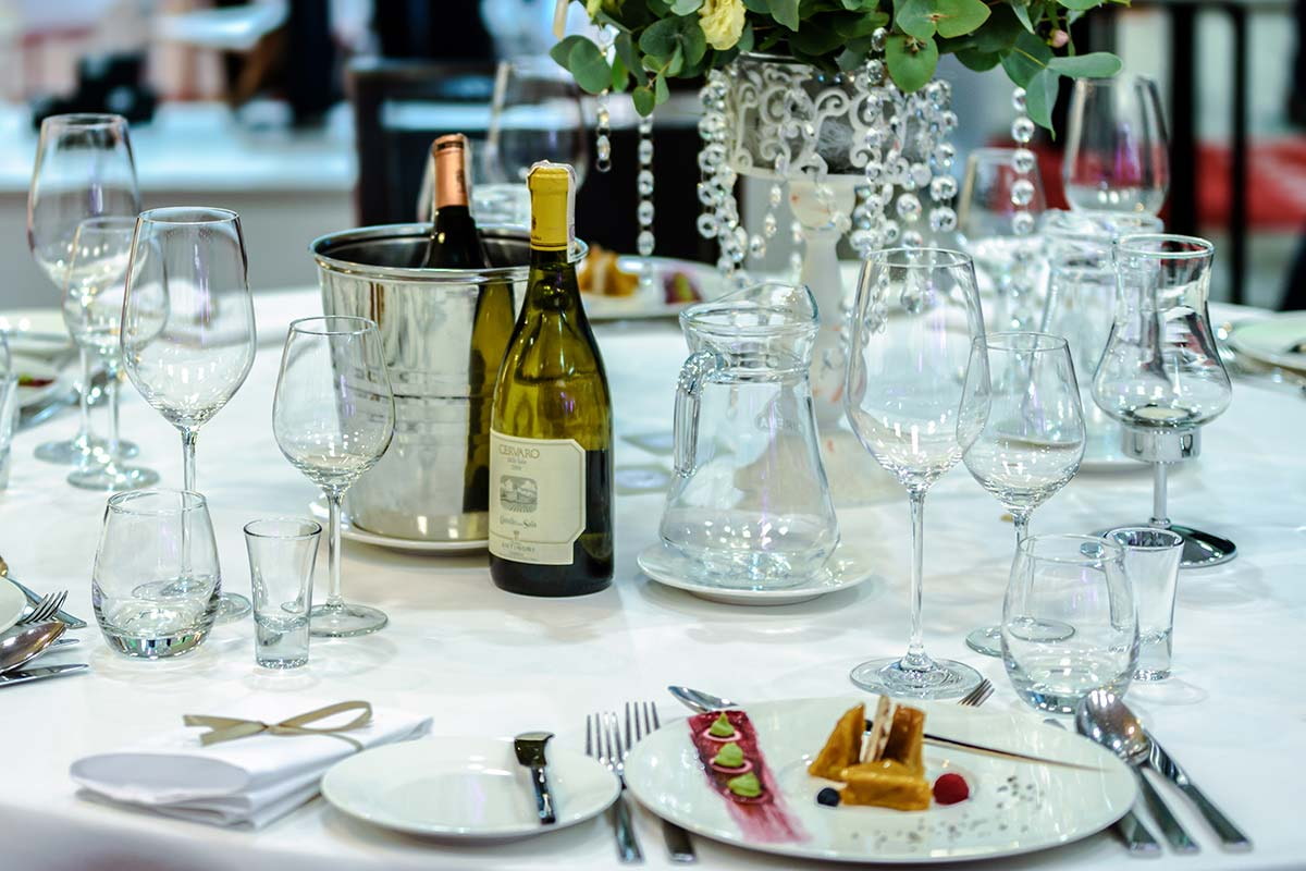 The photo shows the correct arrangement of the dishes, including the champagne glass and dessert cutlery
