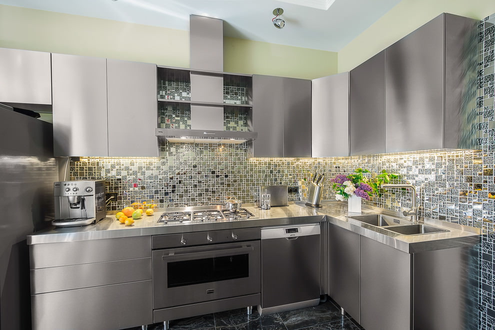 Despite the simplicity of the color, gray can vary in tones, from warm red to blue-gray, almost black and silver. A light gray kitchen set is suitable for a small kitchen and a dark gray for a well-lit large space.
