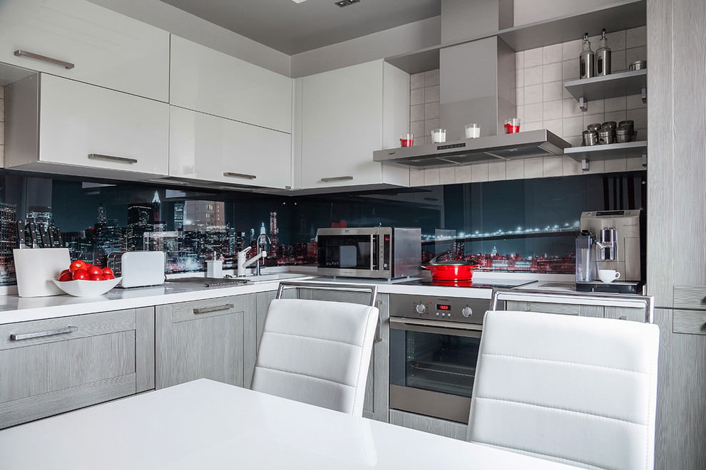 On the picture kitchen with a glass apron with a photo print. This finish is combined with a matte façade.