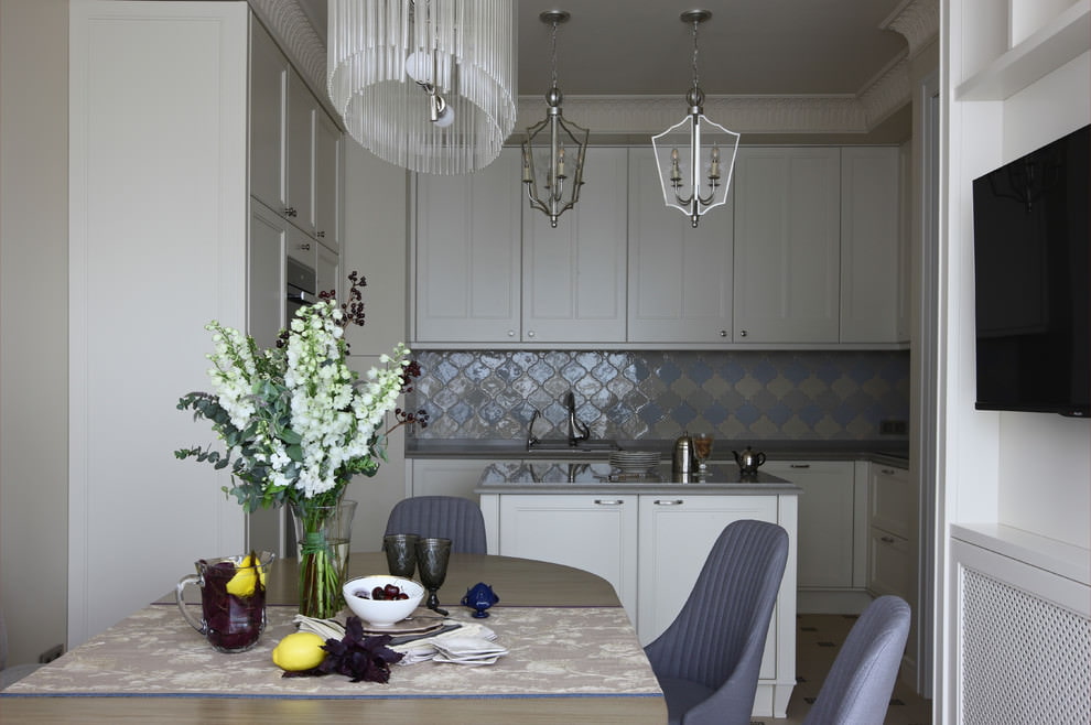 A gray kitchen set is also suitable for a classic kitchen, provided that gray is combined with a stone countertop, a wooden facade with carvings and twisted handles. For the classic style, glass doors, light wallpaper, stone or parquet tiles are appropriate.