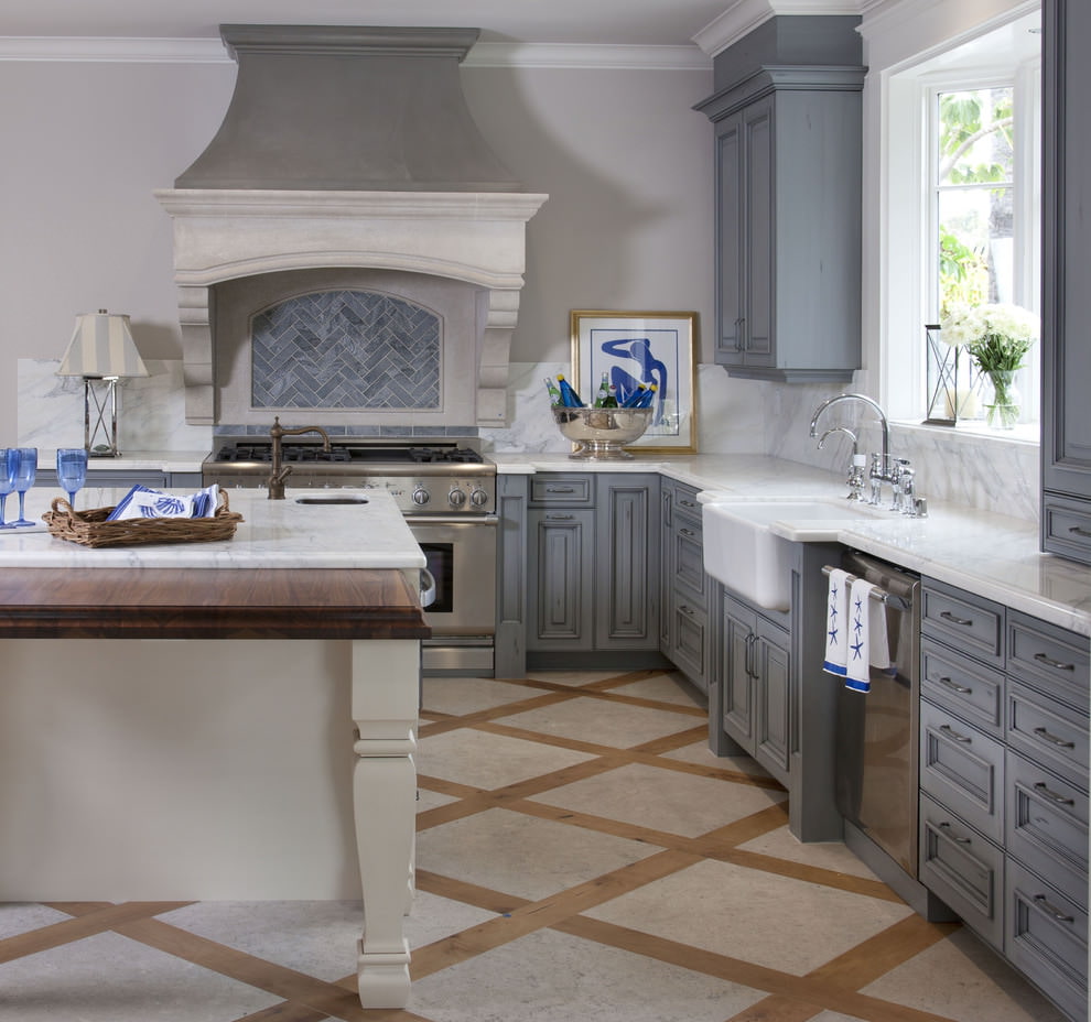 On the picture gray island set in a modern style. Thanks to the abundance of natural light and light finishes, the kitchen looks spacious.