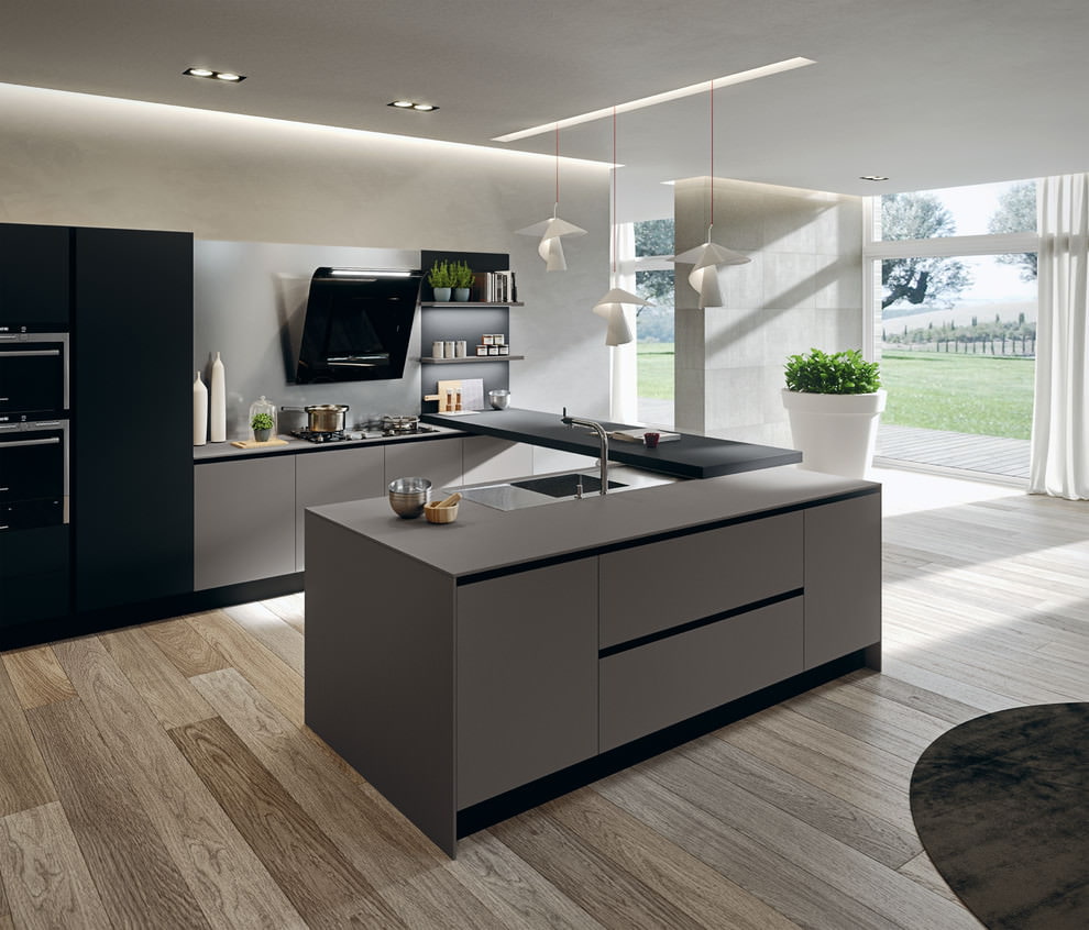 - Black gray a matte kitchen facade is suitable for a spacious kitchen with two windows. There should be more gray and the walls should be white.