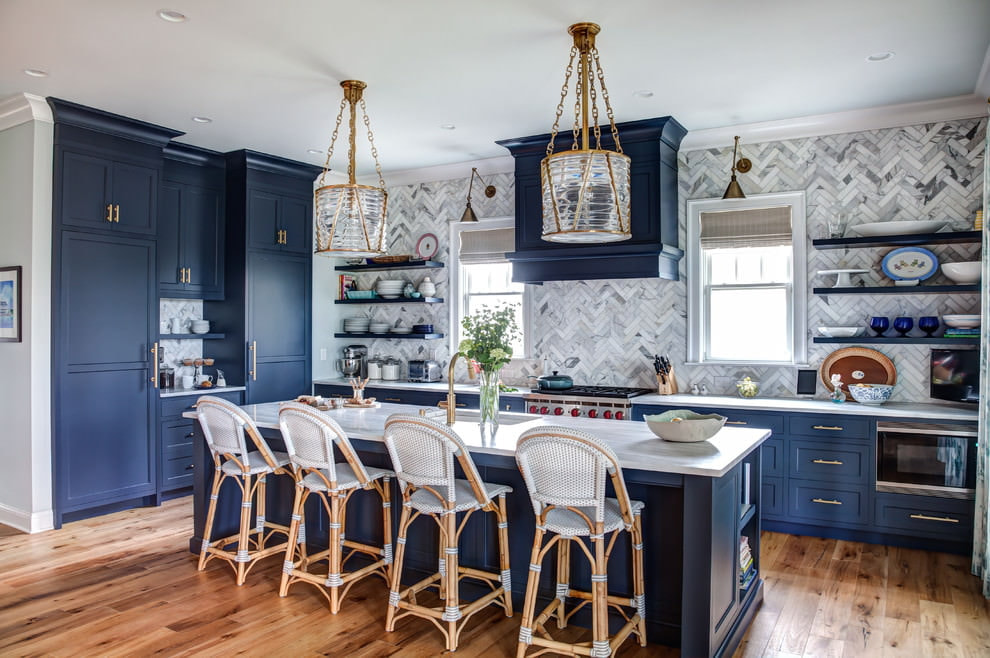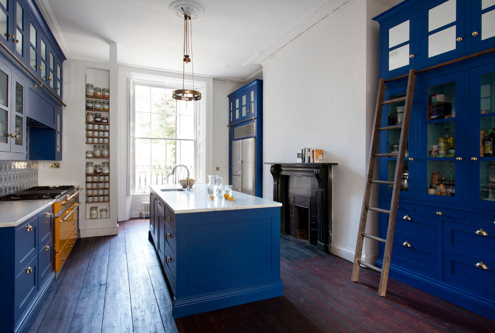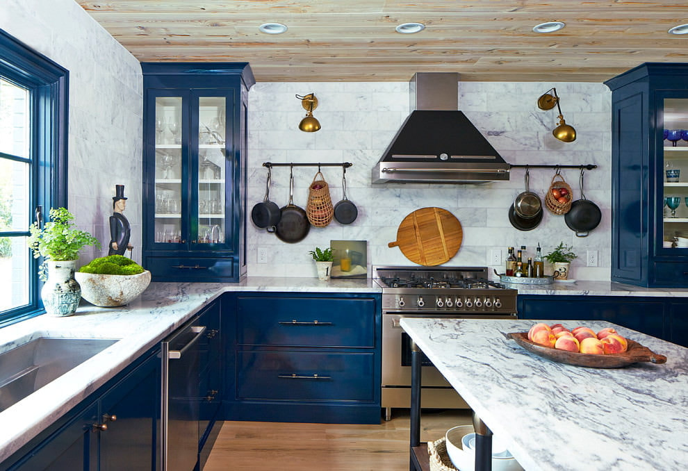 In a classic style, the suite is made of wood with a stone top. The rich blue hue is harmonious with the wooden floor and ornate decorative elements. The interior should not be oversaturated with unnecessary items; an elegant kitchen set will suffice.