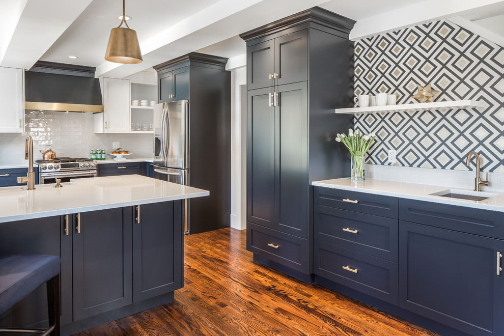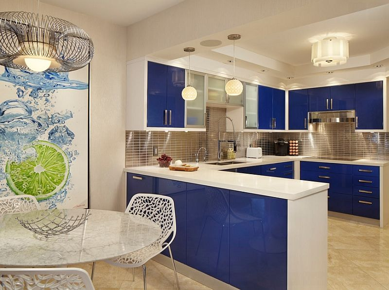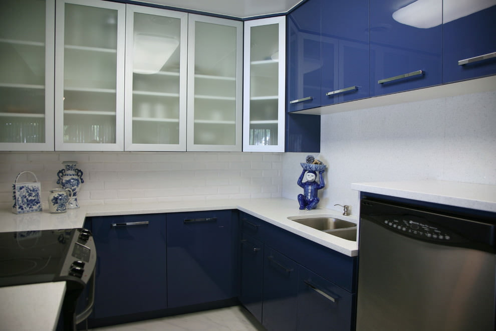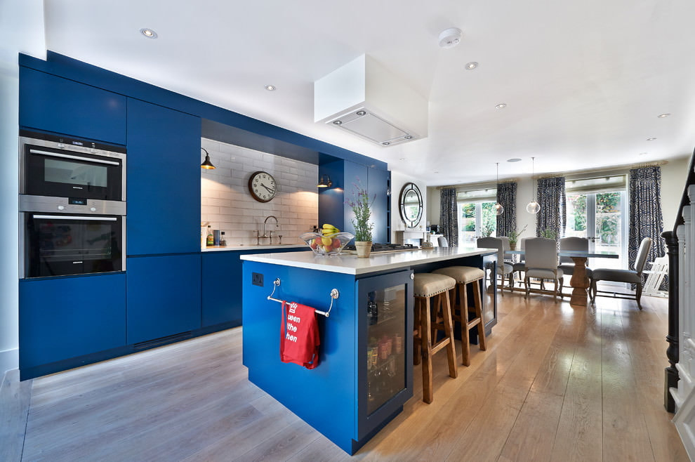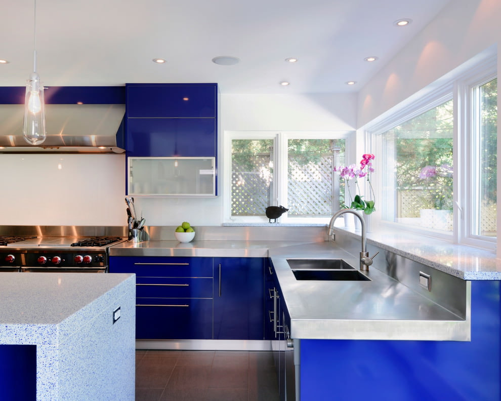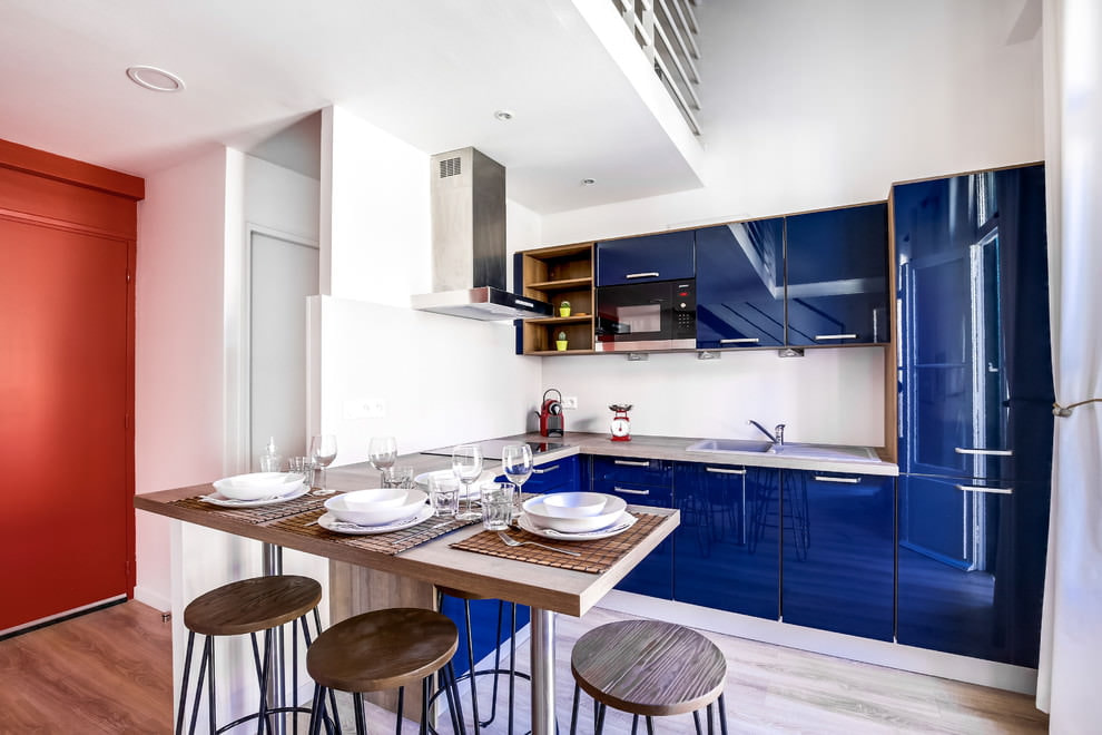 The deep blue color of the kitchen set, straight lines, modern appliances and a shiny surface will look harmonious in a modern style. The interior can be complemented with other colors in the decor.