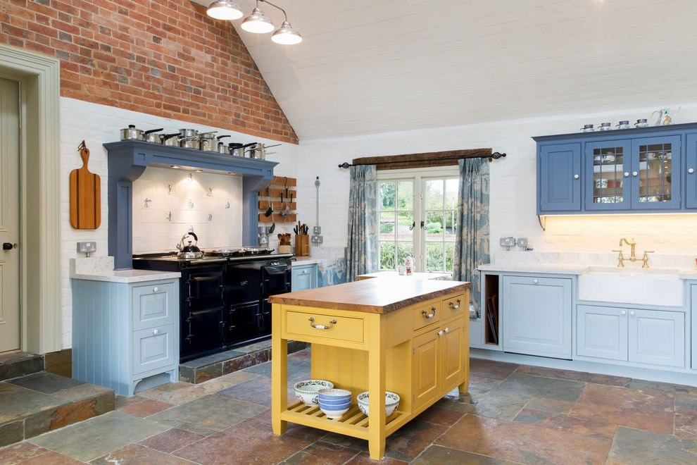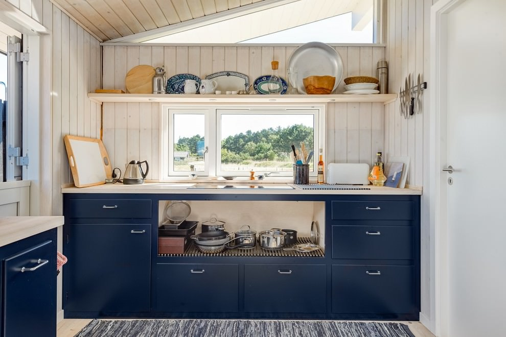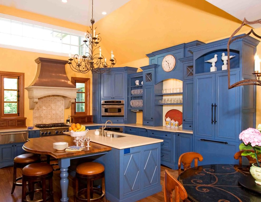 The interior of the country-style kitchen is filled with coziness and warmth. The blue color of the kitchen unit is in harmony with the wooden elements. The design will be complemented by small rugs, tablecloths and painted dishes. The lighting is preferable for country style warm.