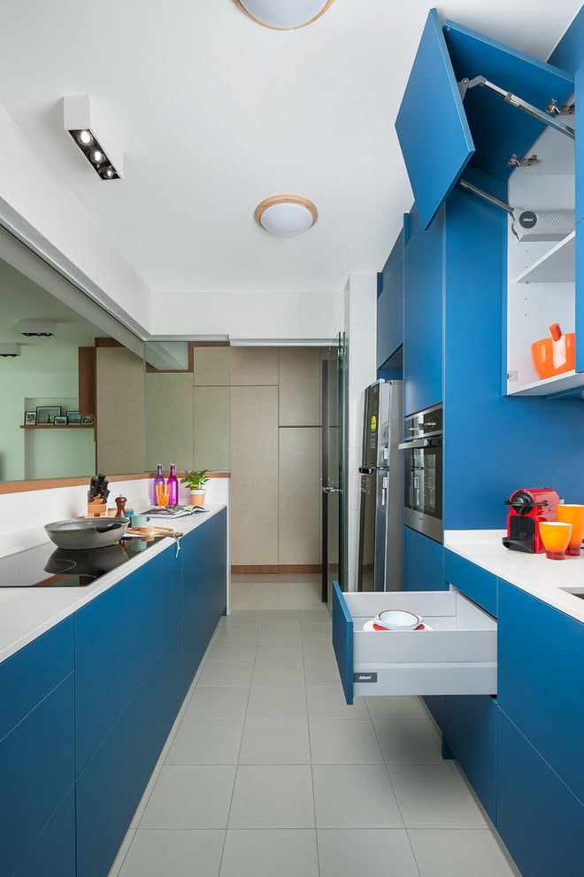 On the picture miniature blue kitchen, mirrored facades of the headset increase the space of the room.