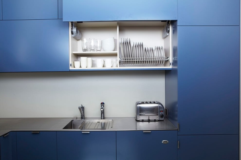Steel is the most practical material of all. Not afraid of heat, water and chemicals, easy to clean and very durable. The only negative is the difficulty with the selection of the interior. The material is cold, if used improperly, it can deprive the kitchen of comfort.