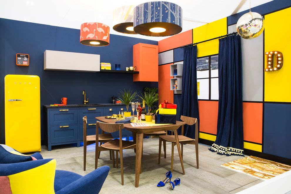 A good combination for a retro style interior. It is worth taking one of the two shades as a basis, and the second will perform a complementary function. The interior is playful and vibrant.