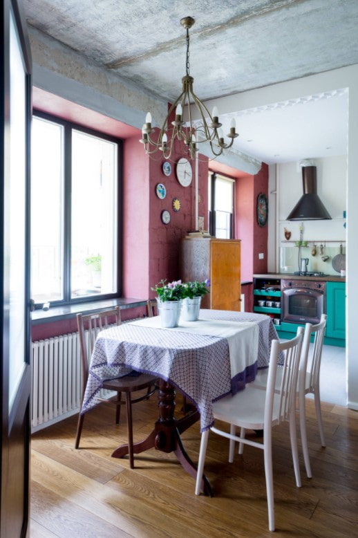To make the table stand out from the rest of the furniture, choose textiles in the same color, style or from the same collection. Towels, potholders, curtains, carpets, napkins, tablecloths can form a single composition.