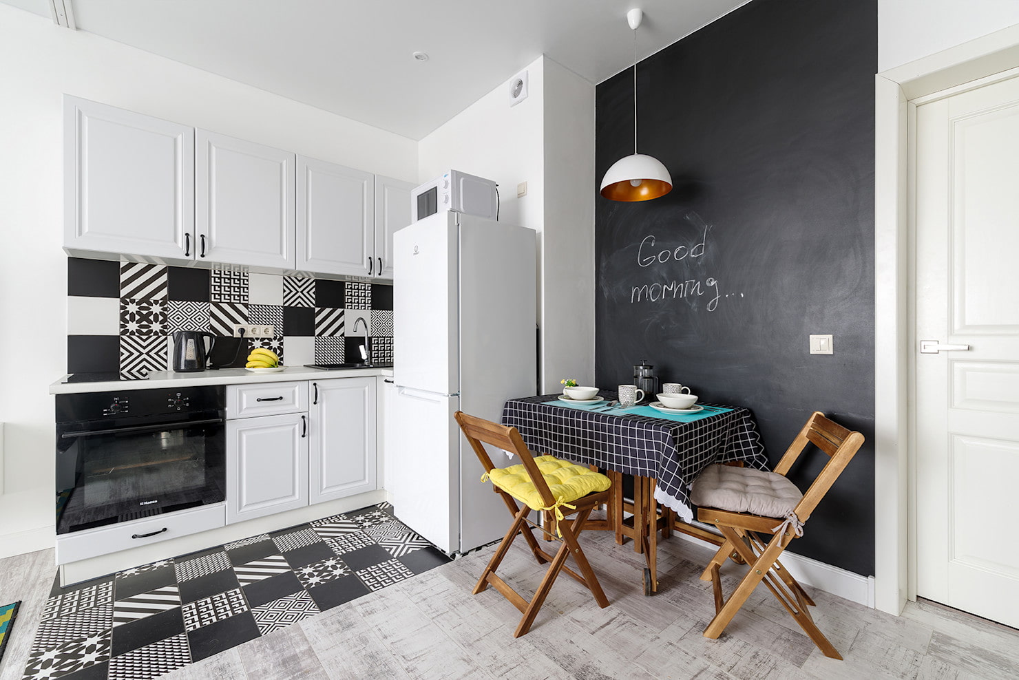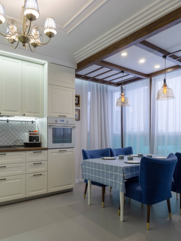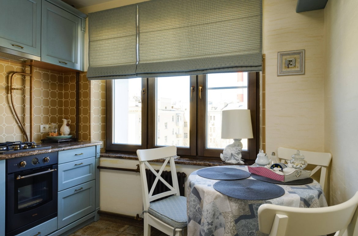 The photo shows a bright kitchen with blue details.