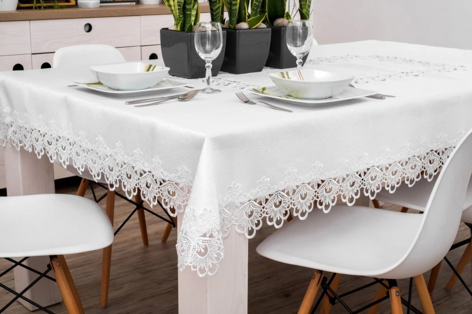 After the tablecloth has taken its place, sit at the table and check: are the edges hanging too much, are they interfering with food intake? Models that are too long should be hemmed.
