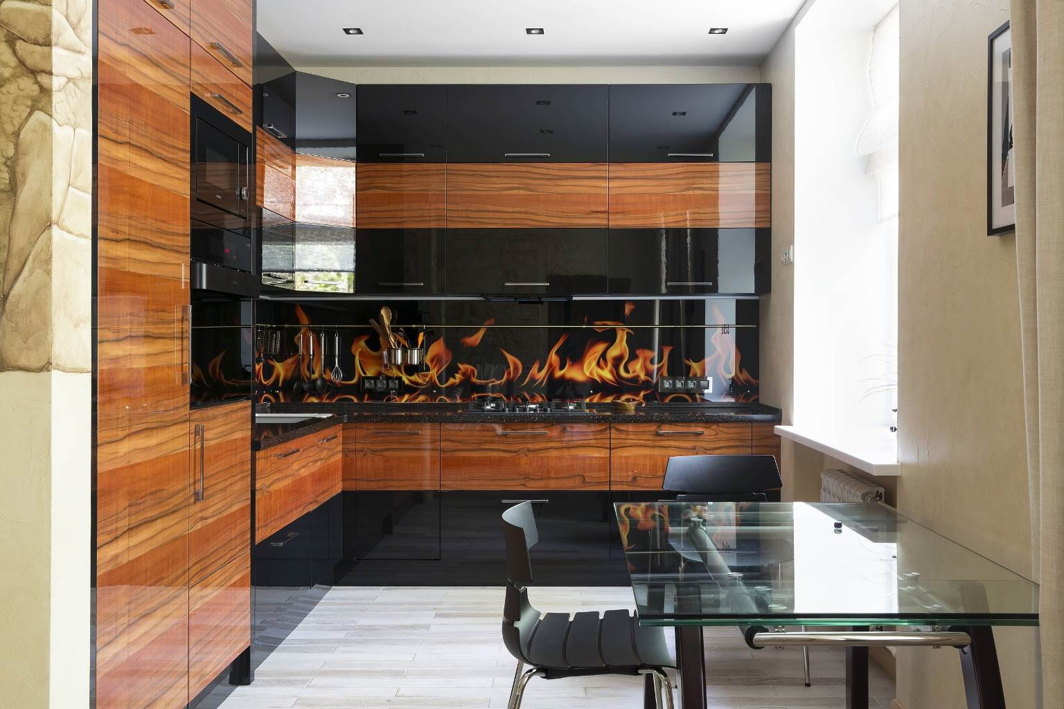 Tempered glass or Stalinite - the most popular material for making kitchen skins. It is heated to 650 degrees Celsius, and then immediately cooled, due to which it acquires phenomenal strength and fire resistance.