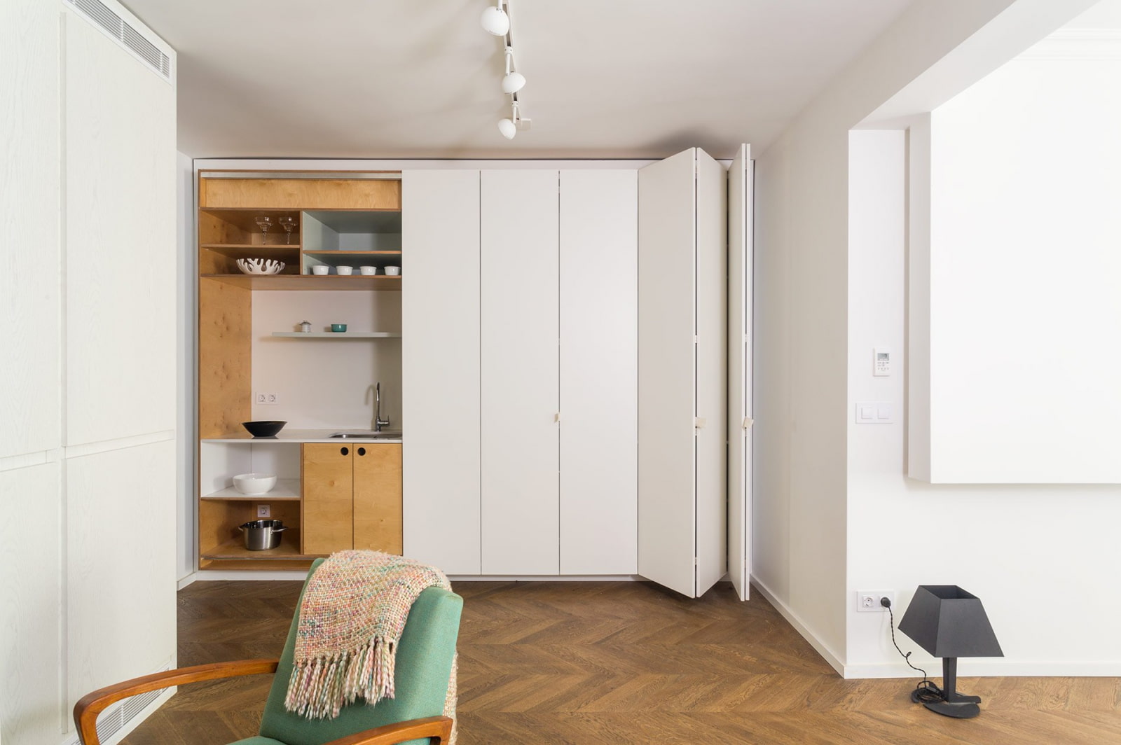 A similar design solution is often used in apartments for daily rent. When the kitchen is required only in individual cases, not of particular importance.