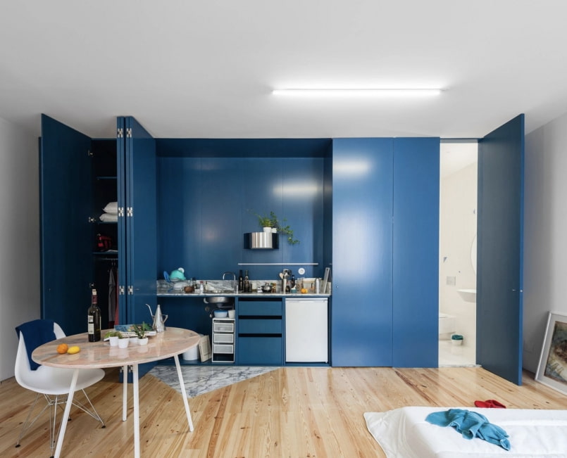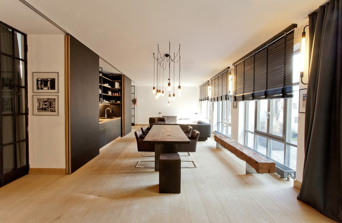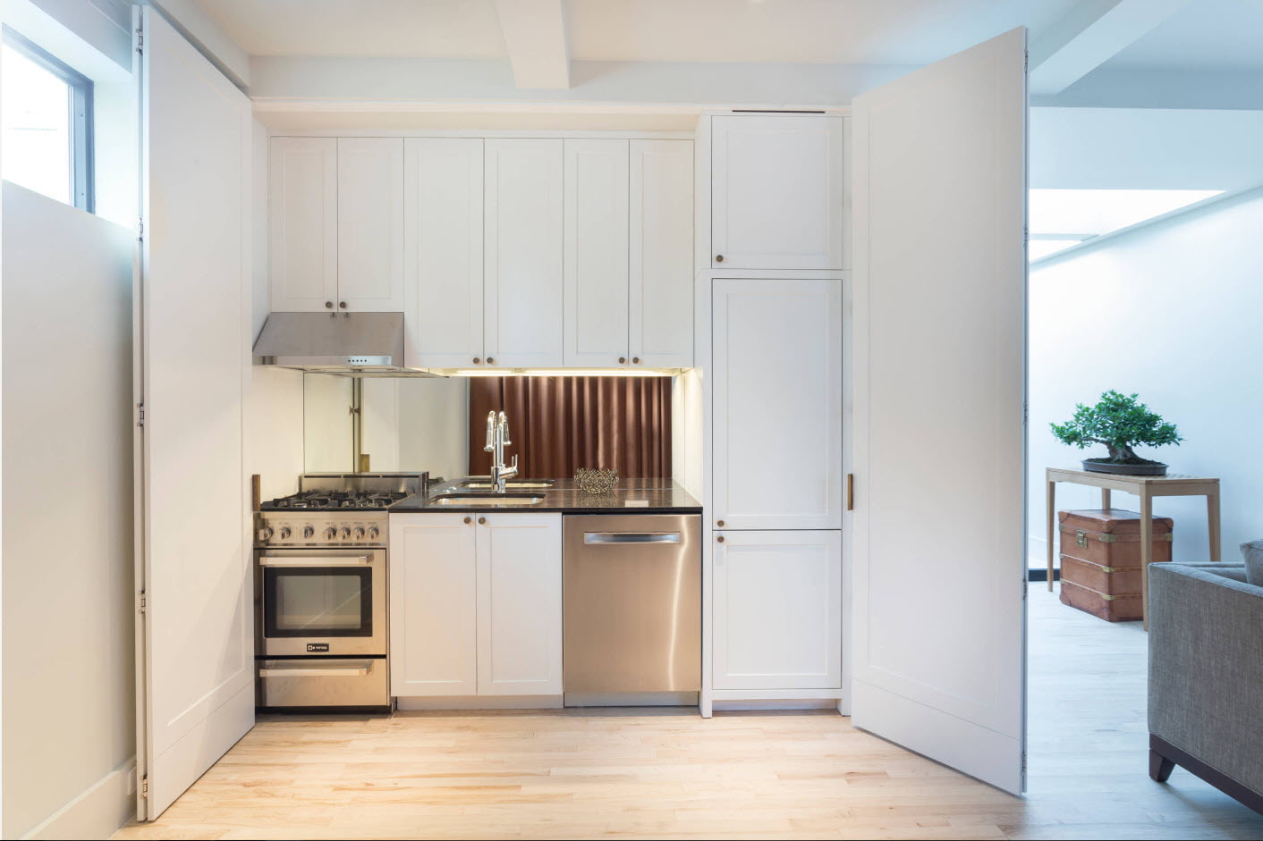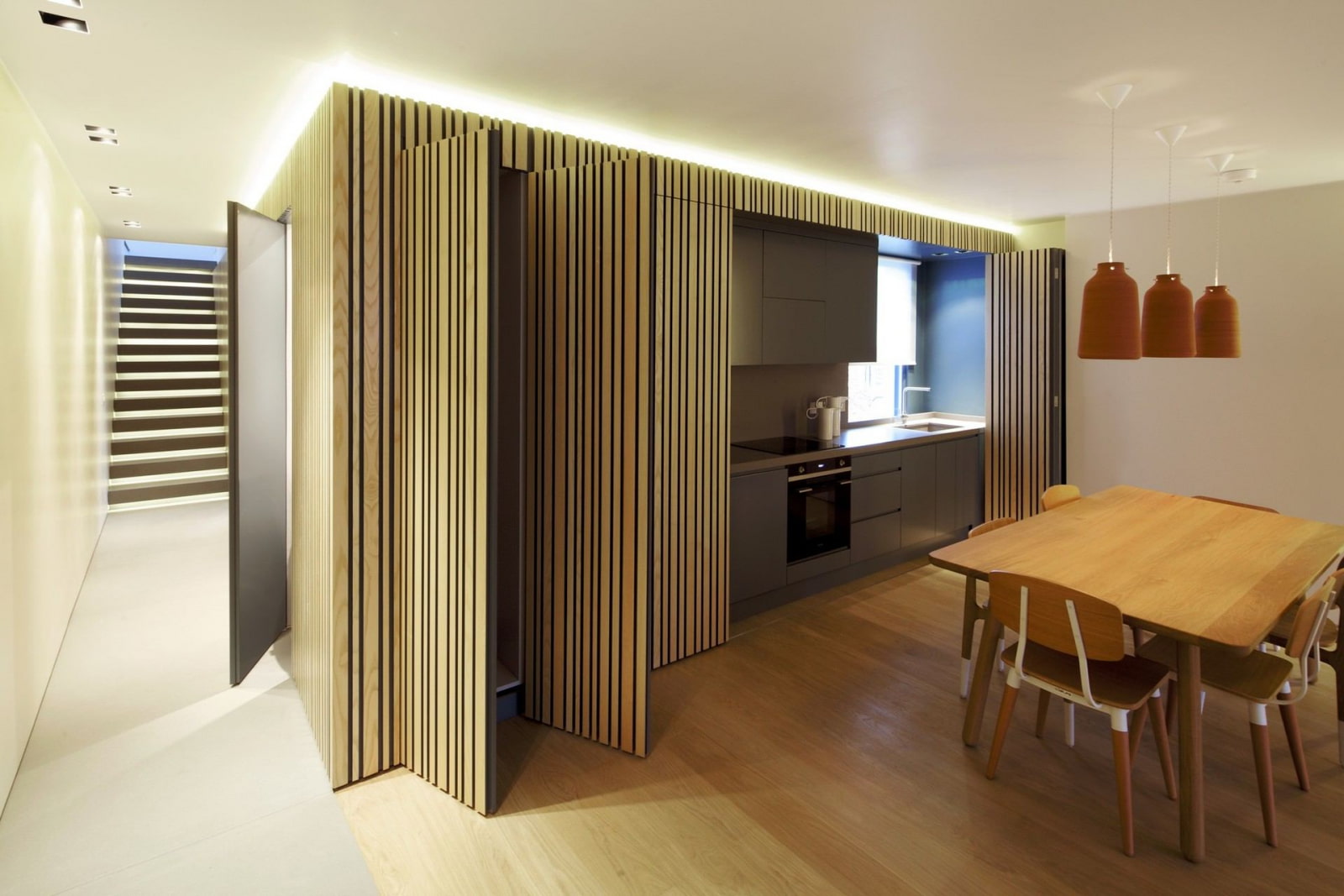 The fourth example is no less interesting.: in a loft-style house with high ceilings, they hid not just furniture, but an entire room. Behind the wooden folding doors-accordion hides a refrigerator, a sink, a stove, an extractor hood, shelves with dishes, two garbage containers.