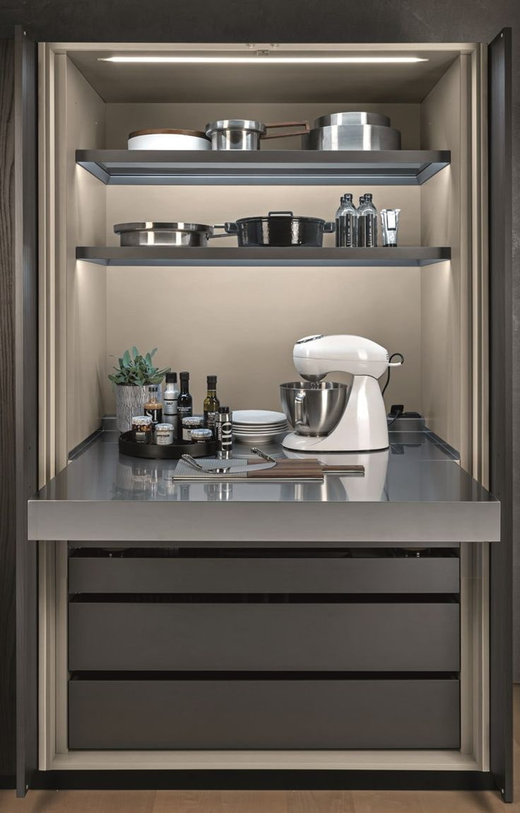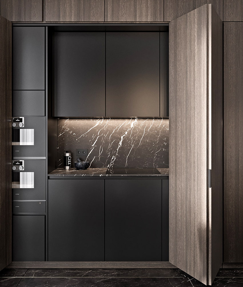 - Versatility... The hidden kitchen is designed in any style: from minimalism, hi-tech, up to low-key classics or even gothic.
