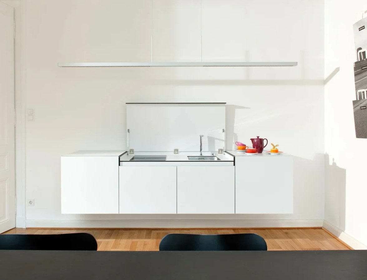 In small studios, where only one room serves as a living room, bedroom, kitchen, invisible installation will be ideal. A closed work surface will allow you to avoid the feeling of a large dining room, making the space more comfortable, homey.