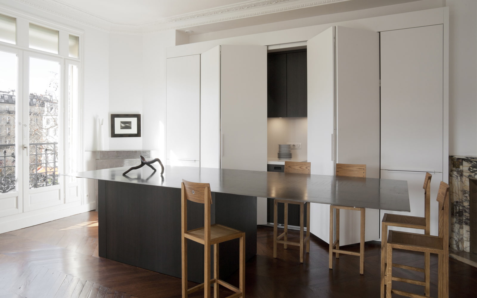 IN most open plan projects use this is the way to create an invisible cooking zone. Above and below, in front of the drawers, guides are installed along which the doors will ride.