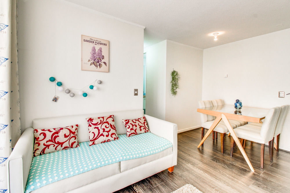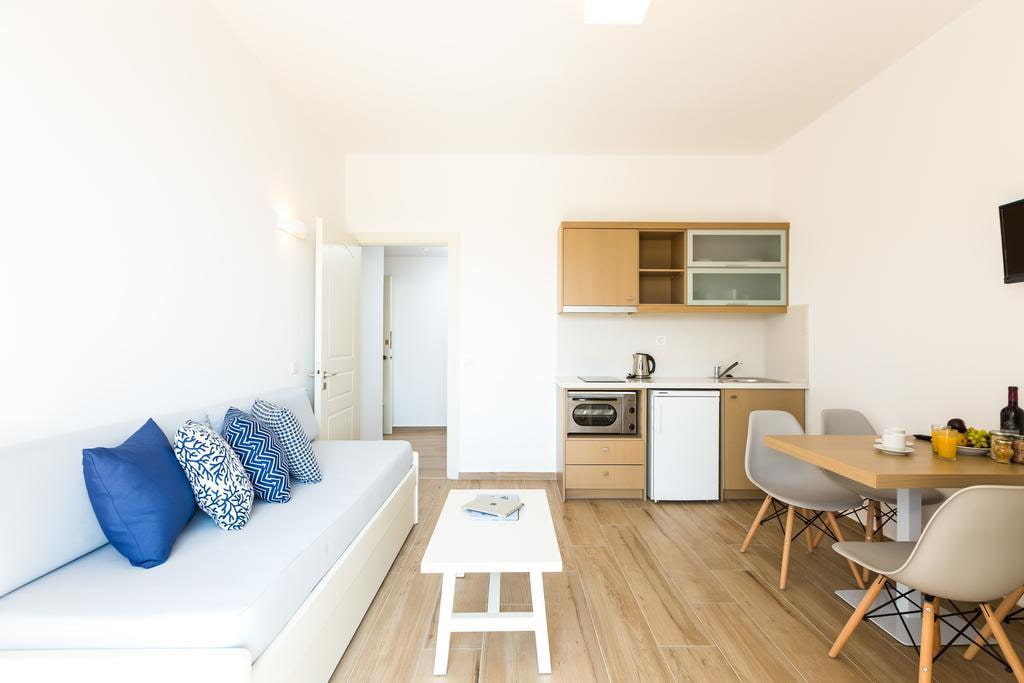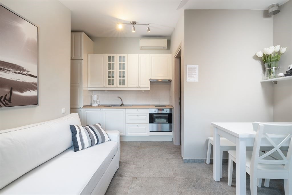 In the photo there is a light folding sofa in the interior of the kitchen-studio.