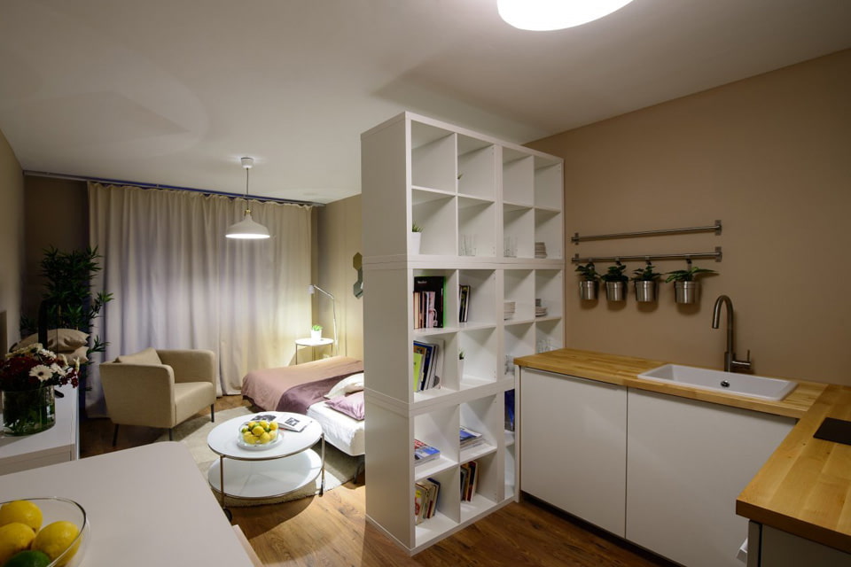 A convenient option for a small kitchen-bedroom will be a mobile transportable screen. Such designs are distinguished by a huge number of models that fit into any design.