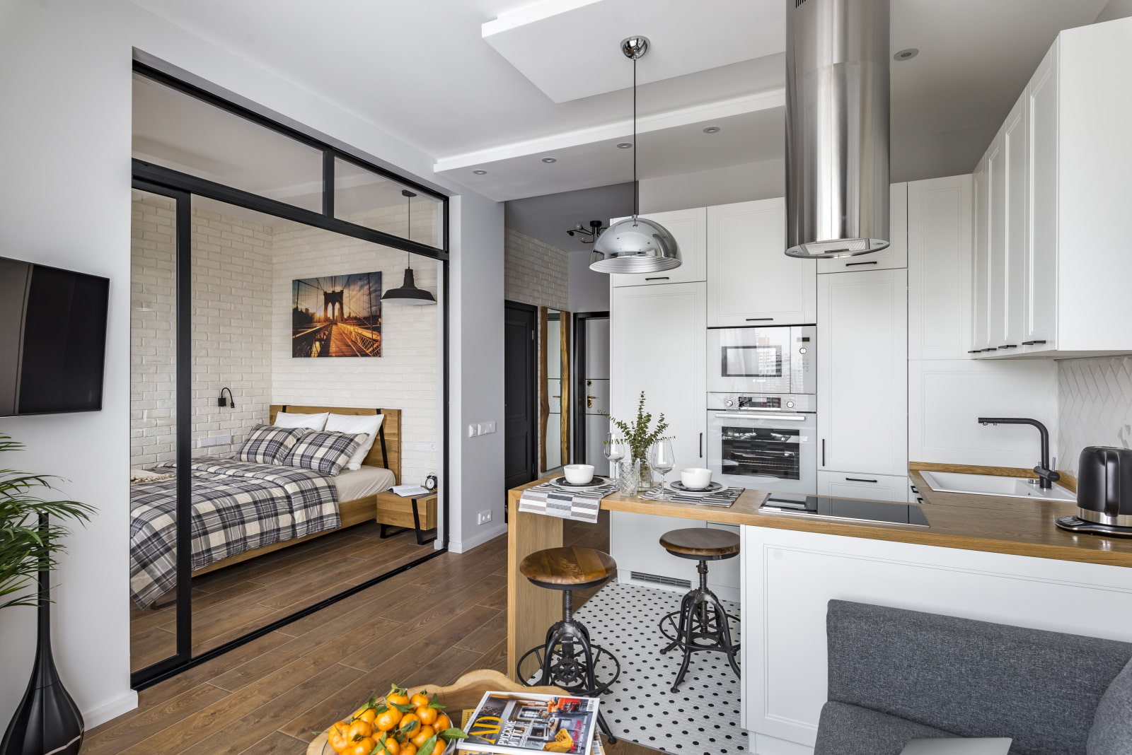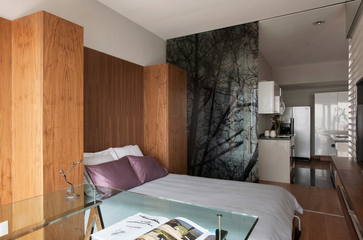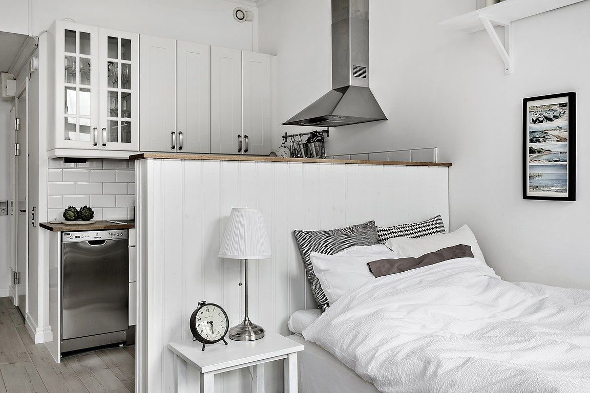 In the photo there is a sleeping area, separated from the kitchen by a compact bar.